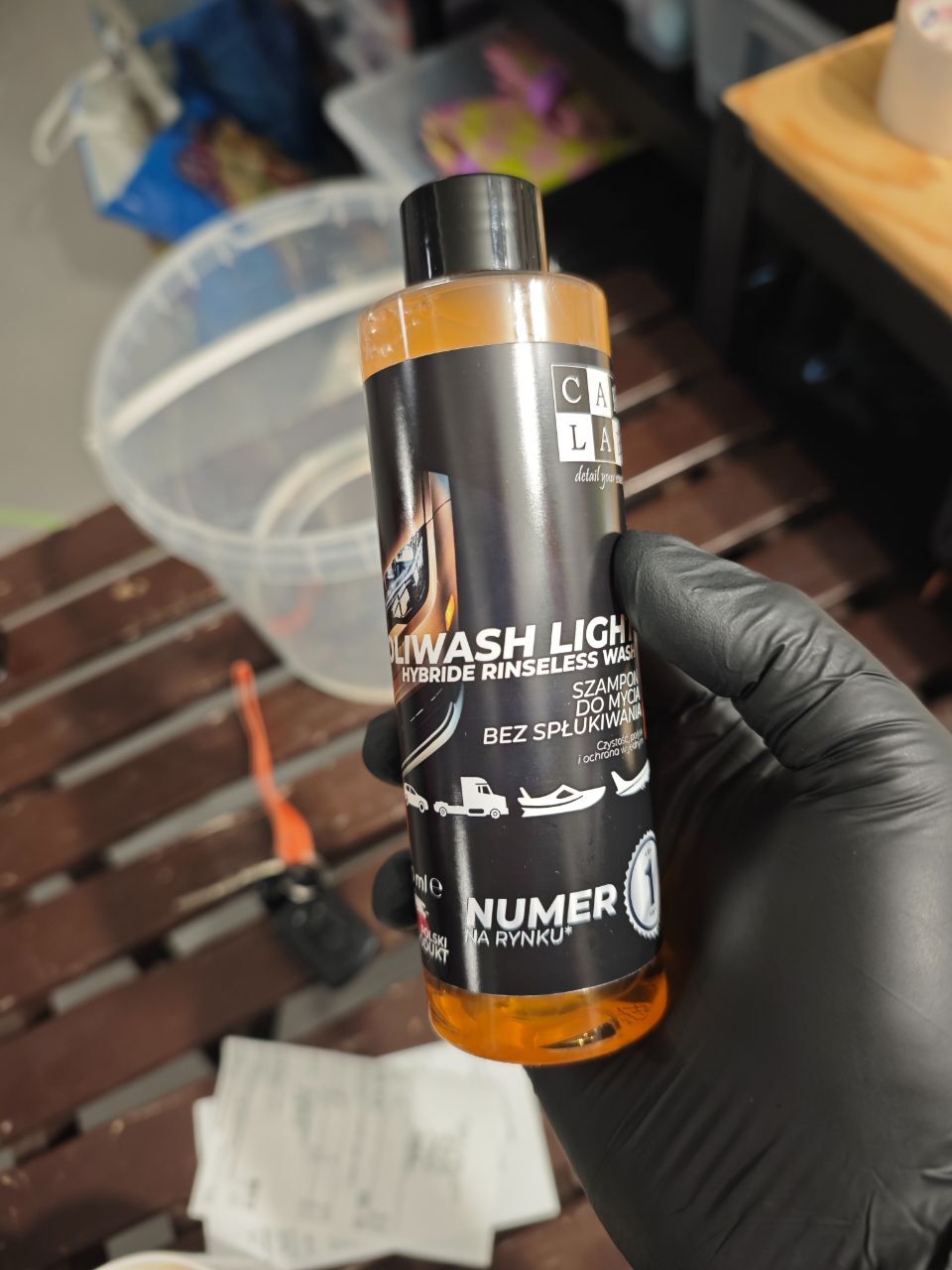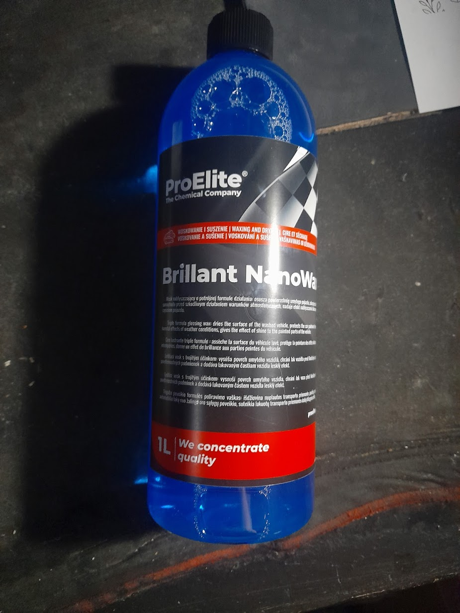 Kolejny wosk z kategorii tych tańszych, znany już na forum ale postanowiłem samemu przeprowadzić klika testów ProElite Brilliant Nanowax. Zapłaciłem 35zł za litrową butelkę koncentratu, czyli dużo bardziej opłacalniejszy wybór niż K2. Wosk ma naprawdę przyjemny, cytrusowy zapach który czuć jeszcze dłuższą chwilę po nałożeniu na auto. Producent zaleca proporcje od 1:200 do 1:50. Wypróbowałem obie wartości i dla mnie efekt był jak po hydrowosku na bezdotyku, bardzo mizerna śliskość, połysk i pomoc w osuszaniu auta. Po kilku próbach doszedłem do efektu który mnie satysfakcjonuje, czyli 1:5. Nie pozostają osady mineralne na lakierze czy szybach, psiknięcie i od razu rozprowadzenie wodą pod ciśnieniem, na koniec wytarcie do sucha. Auto bardzo ładnie się błyszczy, dużo mniej plastikowo niż po K2 a jest bardziej szkliste i głębia czarnego jest bardziej wyciągnięta, kurz aż tak mocno się nie ciągnie. Roztwór przelałem do buteleczki 500ml, średnio na mojego HB schodzi ok. 170-180ml roztworu. Jedynym minusem jest trwałość, maksymalnie 2 tygodnie ale przy tej cenie i łatwości aplikacji można wybaczyć. -