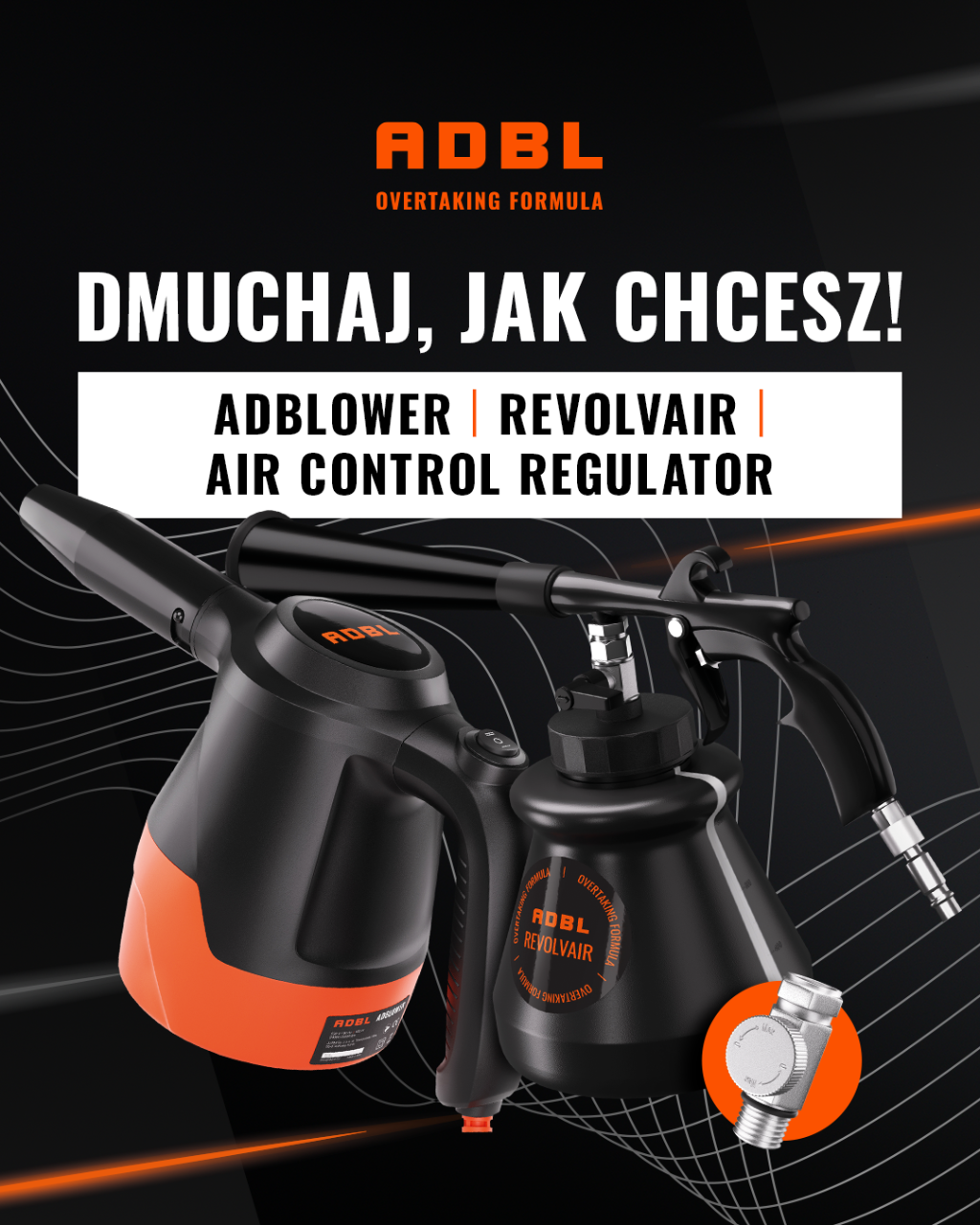 Dystrybutor ADBL Opublikowano 29 Września Dystrybutor Zgłoś Opublikowano 29 Września Dostępne od dziś! ADBL ADBlower, czyli bezdotykowe osuszanie bez ryzyka zarysowań! Ta kompaktowa dmuchawa (zaledwie 0,5 kg!) generuje strumień powietrza o prędkości do 144 km/h, usuwając wodę z każdego zakamarka. W zestawie 6 końcówek i 2 tryby pracy dla precyzyjnego osuszania. Dodatkowo w zestawie znajduje się nasz ADBL Double Mini Twisted Towel! ADBL Revolvair, czyli rewolucja w czyszczeniu wnętrz! Pneumatyczny pistolet do tapicerki, dywaników i plastików, który skutecznie odseparowuje brud. Pojemny zbiornik (800 ml) i metalowa rurka na łożysku gwarantują trwałość, a niezależna kontrola płynu i powietrza zapewnia maksymalną efektywność czyszczenia. Chcesz pełną kontrolę? ADBL Air control regulator pozwala bezstopniowo dostosować ciśnienie i ilość powietrza. Dzięki niemu pracujesz bezpiecznie na delikatnych powierzchniach, ograniczając zużycie powietrza i hałas. 7