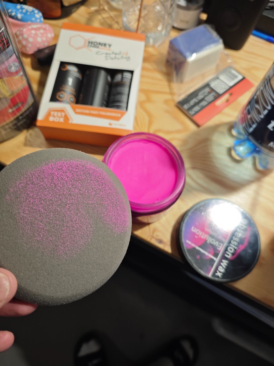 analyzator Opublikowano 29 Września Autor Zgłoś Opublikowano 29 Września U mnie w garażu to zawsze jest wiosna. Wpada wosk który mogę powiedzieć że ma własną grawitację. I należy do elitarnego klubu Obsession wax Evolution rose edition. Bardziej różowego nie było. Ogólnie tu mam trochę kosę z różowymi woskami. Dodo scarlet. Cherry blossom od fireballa. Poorboys. Mają lepsze odpowiedniki. Ale my nie o nich. Wylane bomba. Już na tym etapie mam pewną reminescencje. Ten styl wosku. Było wcześniej na temat pewnej złotej metalowej puszki. Kurcze to samo. Jak rozkładasz ten wosk to jest to taki lekko ciągnący się bardzo przezroczysty i połyskliwy olej. Przy tamtym wosku było naprawdę wielką sztuką żeby go dotrzeć. W zasadzie nie udało mi się do końca rozkminić aplikacji. Co do grawitacji. Ściąga oko. Jest on i reszta. Reszta nie w koj dmuchał. A co tam u alfy? No. Wozi dzieci lata bokiem. I spotyka swoją koleżankę na mieście. Jeszcze raz. Taka fibra inna fibra szukamy. Kolejne podejście. Warunki zbyt stabilne Miało być sprawdzenie co dwie seryjki ale niunia ma inne plane więc wosk i trening się dzisiaj przesunie Wstępne dotarcie i się mazaje robią. Ciągnie się olej. Ale się dotarł No dobra to teraz na serio o tym wosku. Bardzo fajna sprawa na prawdopodobnie 60ty wosk na półce. Jak to już nieraz było naprawdę fajny zakup dla zblazowanych woskowiczów żądnych przygody. Żeby go w ogóle docenić to trzeba przeczytać całe to forum od pierwszego zdania aż do tego postu. I mieć pewną słabość do ćwiczeń fizycznych. Jest bardzo daleko od wosków które aplikują się mistrzowsko bo ani przy samej aplikacji nie będziesz miał tej śliskości, ani gwarancji efektu bez wysiłku. Obok souverana to nie stało. To co będziesz miał to bardzo fajny zapach truskawkowy który unosi się w całym garażu. Satysfakcję i killer look. I potencjalnie pocenie i biceps Sekretem jest wyrównanie tego wosku. Potem dokończenie druga fibra szybkim kolistymi ruchami. Zmiana strony ręcznika. Tudno zaaplikowac mało bo jest przezroczysty i trochę się "klei". Nien wysycha też potem. Dotarty nie daje śliskości a zostaje jeszcze dojrzewać na lakierze i śliskość ma na następny dzień. Ale daje świetna glebie szczególnie na metaliku. Robi coś jednak wyjątkowo. Na moje oko 90% metalowej puszki w wyglądzie. 20% wysiłku w aplikacji. Czas dotarcia to minimum 15 minut. Raczej wyrównanie po 15-20 a potem finalne dotarcie po 25-30 Zgaduje tylko ponownie że to są jakieś żywice. Pojebany wosk dla pojebanych. Mam nadzieję że administrator dostrzeże fakt że ludzie kulturalni przeklinają tylko we właściwych okolicznościach i to są właściwe okoliczności. Jak chcesz rozkminiać ten wosk to wyślij numerek InPostu spakuję i sobie miesiac popróbujesz Co się za stabilne warunki na moim śmiesznym chińskim ekraniku. Chyba się zawiesił bo na każdej fotce jest ta sama godzina i temperatura i wilgotność 5