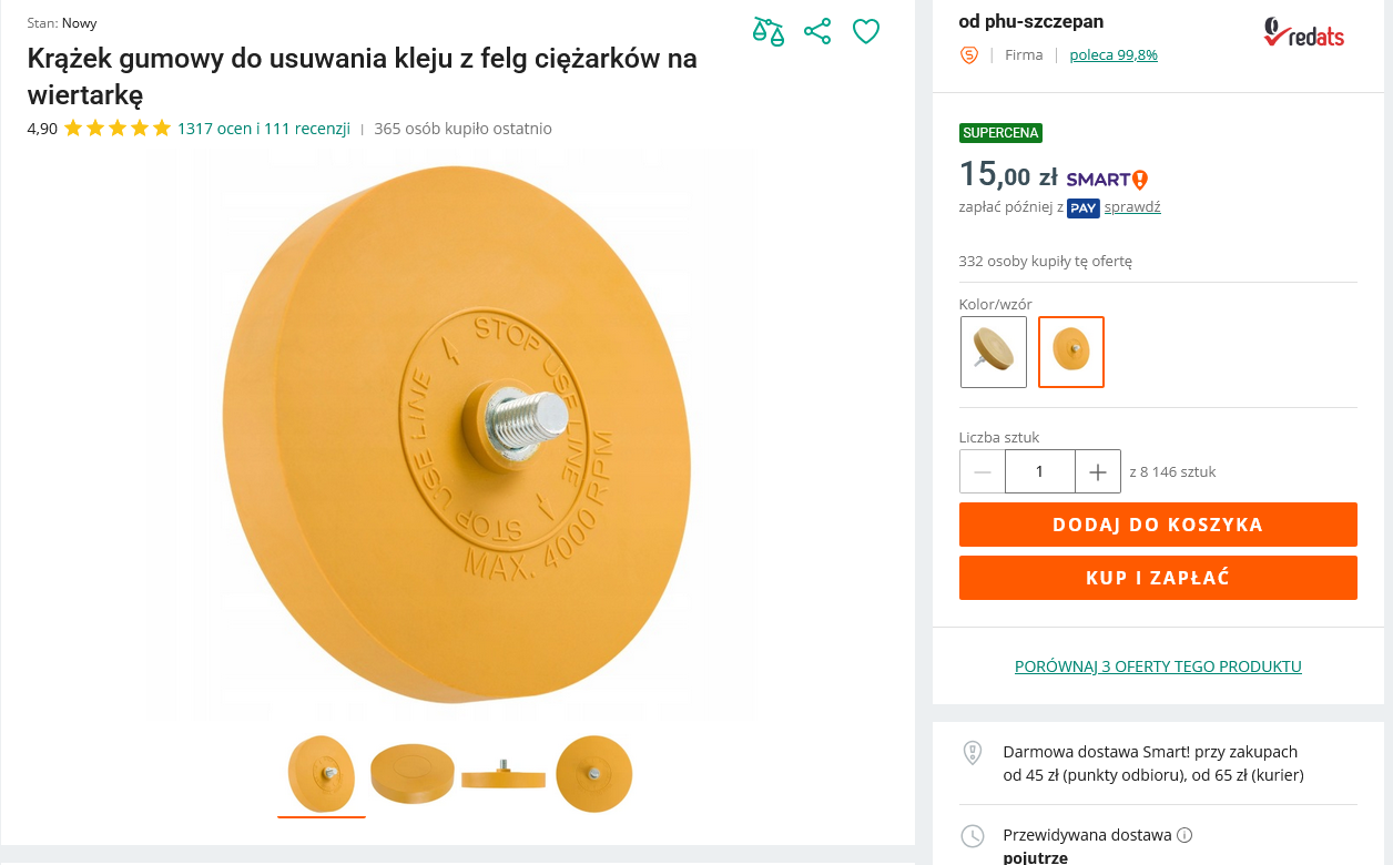 DaV Opublikowano wczoraj o 17:45 Zgłoś Opublikowano wczoraj o 17:45 Krążek ścierny na wkrętarkę Przeważnie sklepy lakiernicze mają go w ofercie, zdaje się też widziałem taki w Leroy Merlin.